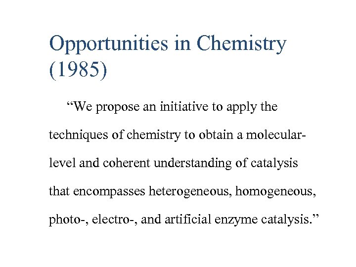 Opportunities in Chemistry (1985) “We propose an initiative to apply the techniques of chemistry to obtain a molecularlevel and coherent understanding of catalysis that encompasses heterogeneous, homogeneous, photo-, electro-, and artificial enzyme catalysis. ”