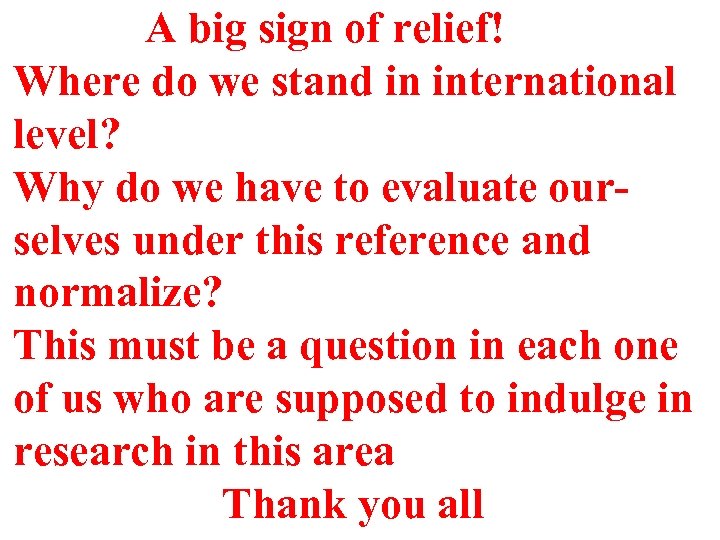 A big sign of relief! Where do we stand in international level? Why do we have to evaluate ourselves under this reference and normalize? This must be a question in each one of us who are supposed to indulge in research in this area Thank you all