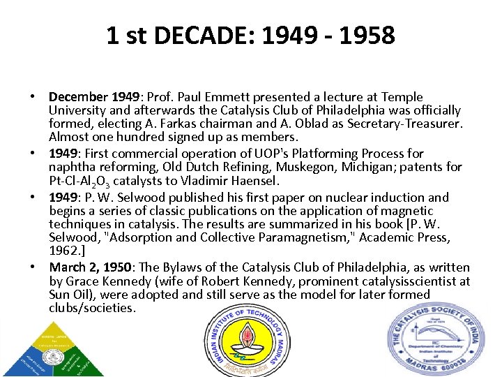 1 st DECADE: 1949 - 1958 • December 1949: Prof. Paul Emmett presented a lecture at Temple University and afterwards the Catalysis Club of Philadelphia was officially formed, electing A. Farkas chairman and A. Oblad as Secretary-Treasurer. Almost one hundred signed up as members. • 1949: First commercial operation of UOP's Platforming Process for naphtha reforming, Old Dutch Refining, Muskegon, Michigan; patents for Pt-Cl-Al 2 O 3 catalysts to Vladimir Haensel. • 1949: P. W. Selwood published his first paper on nuclear induction and begins a series of classic publications on the application of magnetic techniques in catalysis. The results are summarized in his book [P. W. Selwood, "Adsorption and Collective Paramagnetism, " Academic Press, 1962. ] • March 2, 1950: The Bylaws of the Catalysis Club of Philadelphia, as written by Grace Kennedy (wife of Robert Kennedy, prominent catalysisscientist at Sun Oil), were adopted and still serve as the model for later formed clubs/societies.