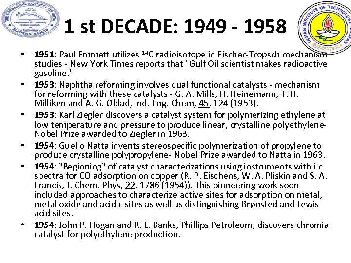 1 st DECADE: 1949 - 1958 • 1951: Paul Emmett utilizes 14 C radioisotope in Fischer-Tropsch mechanism studies - New York Times reports that "Gulf Oil scientist makes radioactive gasoline. " • 1953: Naphtha reforming involves dual functional catalysts - mechanism for reforming with these catalysts - G. A. Mills, H. Heinemann, T. H. Milliken and A. G. Oblad, Ind. Eng. Chem, 45, 124 (1953). • 1953: Karl Ziegler discovers a catalyst system for polymerizing ethylene at low temperature and pressure to produce linear, crystalline polyethylene- Nobel Prize awarded to Ziegler in 1963. • 1954: Guelio Natta invents stereospecific polymerization of propylene to produce crystalline polypropylene- Nobel Prize awarded to Natta in 1963. • 1954: "Beginning" of catalyst characterizations using instruments with i. r. spectra for CO adsorption on copper (R. P. Eischens, W. A. Pliskin and S. A. Francis, J. Chem. Phys, 22, 1786 (1954)). This pioneering work soon included approaches to characterize active sites for adsorption on metal, metal oxide and acidic sites as well as distinguishing Brønsted and Lewis acid sites. • 1954: John P. Hogan and R. L. Banks, Phillips Petroleum, discovers chromia catalyst for polyethylene production.