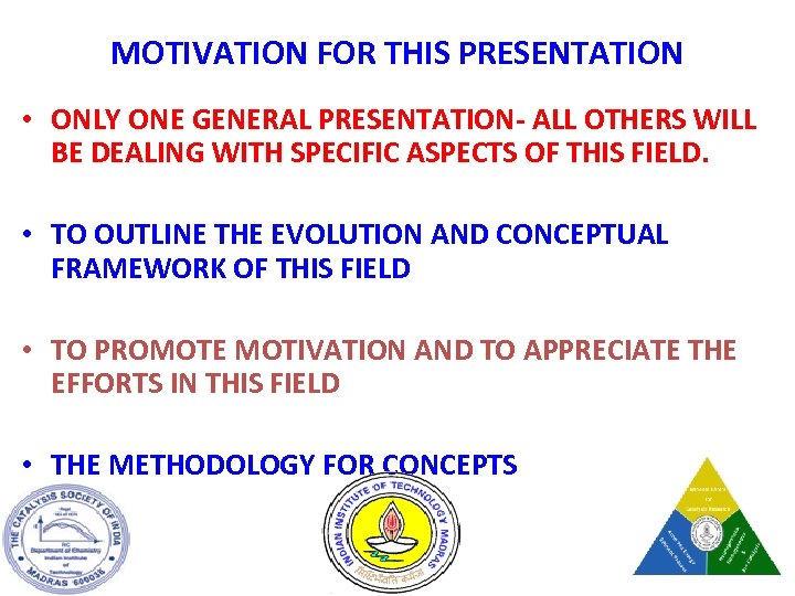 MOTIVATION FOR THIS PRESENTATION • ONLY ONE GENERAL PRESENTATION- ALL OTHERS WILL BE DEALING WITH SPECIFIC ASPECTS OF THIS FIELD. • TO OUTLINE THE EVOLUTION AND CONCEPTUAL FRAMEWORK OF THIS FIELD • TO PROMOTE MOTIVATION AND TO APPRECIATE THE EFFORTS IN THIS FIELD • THE METHODOLOGY FOR CONCEPTS
