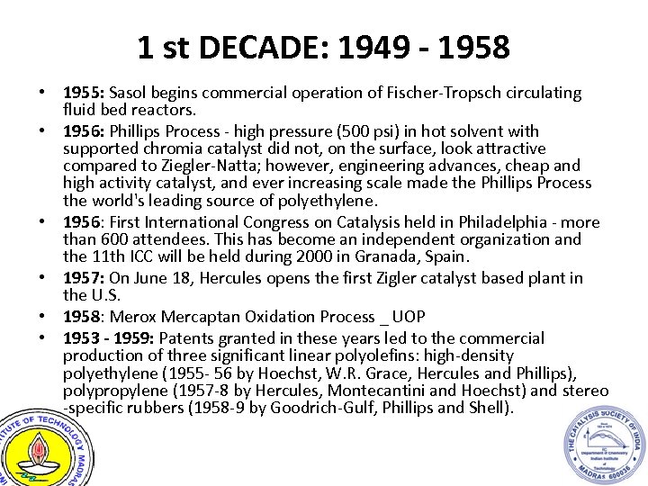 1 st DECADE: 1949 - 1958 • 1955: Sasol begins commercial operation of Fischer-Tropsch circulating fluid bed reactors. • 1956: Phillips Process - high pressure (500 psi) in hot solvent with supported chromia catalyst did not, on the surface, look attractive compared to Ziegler-Natta; however, engineering advances, cheap and high activity catalyst, and ever increasing scale made the Phillips Process the world's leading source of polyethylene. • 1956: First International Congress on Catalysis held in Philadelphia - more than 600 attendees. This has become an independent organization and the 11 th ICC will be held during 2000 in Granada, Spain. • 1957: On June 18, Hercules opens the first Zigler catalyst based plant in the U. S. • 1958: Merox Mercaptan Oxidation Process _ UOP • 1953 - 1959: Patents granted in these years led to the commercial production of three significant linear polyolefins: high-density polyethylene (1955 - 56 by Hoechst, W. R. Grace, Hercules and Phillips), polypropylene (1957 -8 by Hercules, Montecantini and Hoechst) and stereo -specific rubbers (1958 -9 by Goodrich-Gulf, Phillips and Shell).