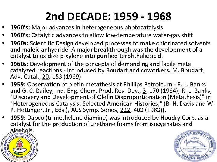 2 nd DECADE: 1959 - 1968 • 1960's: Major advances in heterogeneous photocatalysis • 1960's: Catalytic advances to allow low-temperature water-gas shift • 1960 s: Scientific Design developed processes to make chlorinated solvents and maleic anhydride. A major breakthrough was the development of a catalyst to oxidize p-xylene into purified terphthalic acid. • 1960 s: Development of the concepts of demanding and facile metal catalyzed reactions - introduced by Boudart and coworkers. M. Boudart, Adv. Catal. , 20, 153 (1969) • 1959: Observation of olefin metathesis at Phillips Petroleum - R. L. Banks and G. C. Bailey, Ind. Eng. Chem. Prod. Res. Dev. , 3, 170 (1964); R. L. Banks, "Discovery and Development of Olefin Disproportionation (Metathesis)" in "Heterogeneous Catalysis: Selected American Histories, " (B. H. Davis and W. P. Hettinger, Jr. , Eds. ), ACS Symp. Series, 222, 403 (1983)). • 1959: Dabco (trimethylene diamine) was introduced by Houdry Corp. as a catalyst for the production of urethane foams from isocyanates and alcohols.