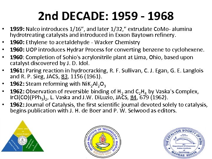 2 nd DECADE: 1959 - 1968 • 1959: Nalco introduces 1/16", and later 1/32, " extrudate Co. Mo- alumina hydrotreating catalysts and introduced in Exxon Baytown refinery. • 1960: Ethylene to acetaldehyde - Wacker Chemistry • 1960: UOP introduces Hydrar Process for converting benzene to cyclohexene. • 1960: Completion of Sohio's acrylonitrile plant at Lima, Ohio, based upon catalyst discovered by J. D. Idol. • 1961: Paring reaction in hydrocracking, R. F. Sullivan, C. J. Egan, G. E. Langlois and R. P. Sieg, JACS, 83, 1156 (1961). • 1962: Steam reforming with Ni. K 2 Al 2 O 3 • 1962: Observation of reversible binding of H 2 and C 2 H 4 by Vaska's Complex, Ir. Cl(CO)(PPh 3)2, L. Vaska and J. W. Di. Luzio, JACS, 84, 679 (1962). • 1962: Journal of Catalysis, the first scientific journal devoted solely to catalysis, begins publication with J. H. de Boer and P. W. Selwood as editors.