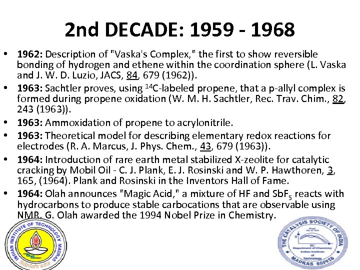 2 nd DECADE: 1959 - 1968 • 1962: Description of "Vaska's Complex, " the first to show reversible bonding of hydrogen and ethene within the coordination sphere (L. Vaska and J. W. D. Luzio, JACS, 84, 679 (1962)). • 1963: Sachtler proves, using 14 C-labeled propene, that a p-allyl complex is formed during propene oxidation (W. M. H. Sachtler, Rec. Trav. Chim. , 82, 243 (1963)). • 1963: Ammoxidation of propene to acrylonitrile. • 1963: Theoretical model for describing elementary redox reactions for electrodes (R. A. Marcus, J. Phys. Chem. , 43, 679 (1963)). • 1964: Introduction of rare earth metal stabilized X-zeolite for catalytic cracking by Mobil Oil - C. J. Plank, E. J. Rosinski and W. P. Hawthoren, 3, 165, (1964). Plank and Rosinski in the Inventors Hall of Fame. • 1964: Olah announces "Magic Acid, " a mixture of HF and Sb. F 5 reacts with hydrocarbons to produce stable carbocations that are observable using NMR. G. Olah awarded the 1994 Nobel Prize in Chemistry.