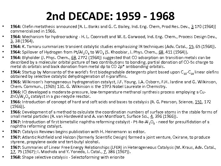 2 nd DECADE: 1959 - 1968 • • • • 1964: Olefin metathesis announced [R. L. Banks and G. C. Bailey, Ind. Eng. Chem, Prod Res. Dev. , 3 170 (1964)] commercialized in 1966. 1964: Mechanism for hydrocracking - H. L. Coonradt and W. E. Garwood, Ind. Eng. Chem. , Process Design Dev. , 3, 38 (1964). 1964: K. Tamaru summarizes transient catalytic studies emphasizing IR techniques (Adv. Catal. , 15, 65 (1964)). 1964: Spillover of Hydrogen from Pt/Al 2 O 3 to WO 3 (S. Khoobiar, J. Phys. Chem. , 68, 411 (1964)). 1964: Blyholder (J. Phys. Chem. , 68, 2772 (1964)) suggested that CO adsorption on transition metals can be described by a molecular orbital picture of two contributions to bonding, partial donation of CO-5 s charge to metal ds orbitals and back donation from metal dp to CO 2 p* antibonding orbitals. 1964: Startup by Monsanto of the world's first biodegradable detergents plant based upon C 10 -C 14 linear olefins obtained by selective catalytic dehydrogenation of n-paraffins. 1965: Wilkinson's homogeneous hydrogenation catalyst, J. F. Young, J. A. Osborn, F. H. Jardine and G. Wilkinson, Chem. Commun. , (1965) 131. G. Wilkinson is the 1973 Nobel Laureate in Chemistry. 1966: ICI developed a moderate-pressure, low-temperature methanol synthesis process employing a Cu. Zn. O/Al 2 O 3 catalyst in a gas-recycle reactor. 1966: Introduction of concept of hard and soft acids and bases to catalysis (R. G. Pearson, Science, 151, 172 (1966)). 1966: Development of a method to calculate the coordination numbers of surface atoms in the stable forms of small metal particles (R. van Hardeveld and A. van Montfoort, Surface Sci. , 4, 396 (1966)). 1967: Introduction of first bimetallic naphtha reforming catalyst - Pt-Re-Al 2 O 3 - need for presulfidation of a naphtha reforming catalyst. 1967: Catalysis Reviews begins publication with H. Heinemann as editor. 1967: Atlantic Richfield and Halcon (formerly Scientific Design) formed a joint venture, Oxirane, to produce styrene, propylene oxide and tert-butyl alcohol. 1967: Summaries of Linear Free Energy Relationships (LFER) in Heterogeneous Catalysis (M. Kraus, Adv. Catal. , 17, 75 (1967); I. Mochida and Y. Yoneda, J. Catal. , 7, 386 (1967)). 1968: Shape selective catalysis - Selectoforming with erionite