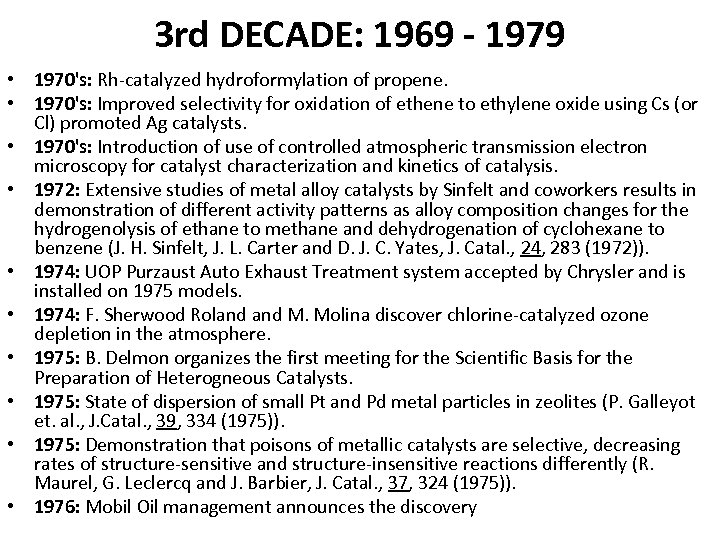 3 rd DECADE: 1969 - 1979 • 1970's: Rh-catalyzed hydroformylation of propene. • 1970's: Improved selectivity for oxidation of ethene to ethylene oxide using Cs (or Cl) promoted Ag catalysts. • 1970's: Introduction of use of controlled atmospheric transmission electron microscopy for catalyst characterization and kinetics of catalysis. • 1972: Extensive studies of metal alloy catalysts by Sinfelt and coworkers results in demonstration of different activity patterns as alloy composition changes for the hydrogenolysis of ethane to methane and dehydrogenation of cyclohexane to benzene (J. H. Sinfelt, J. L. Carter and D. J. C. Yates, J. Catal. , 24, 283 (1972)). • 1974: UOP Purzaust Auto Exhaust Treatment system accepted by Chrysler and is installed on 1975 models. • 1974: F. Sherwood Roland M. Molina discover chlorine-catalyzed ozone depletion in the atmosphere. • 1975: B. Delmon organizes the first meeting for the Scientific Basis for the Preparation of Heterogneous Catalysts. • 1975: State of dispersion of small Pt and Pd metal particles in zeolites (P. Galleyot et. al. , J. Catal. , 39, 334 (1975)). • 1975: Demonstration that poisons of metallic catalysts are selective, decreasing rates of structure-sensitive and structure-insensitive reactions differently (R. Maurel, G. Leclercq and J. Barbier, J. Catal. , 37, 324 (1975)). • 1976: Mobil Oil management announces the discovery