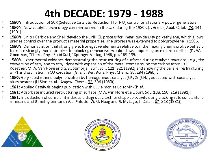 • • • 4 th DECADE: 1979 - 1988 1980's: Introduction of SCR (Selective Catalytic Reduction) for NOx control on stationary power generators. 1980's: New catalytic technology commercialized in the U. S. during the 1980's (J. Armor, Appl. Catal. , 78, 141 (1991)). 1980's: Union Carbide and Shell develop the UNIPOL process for linear low-density polyethylene, which allows precise control over the product's material properties. The process was extended to polypropylene in 1985. 1980's: Demonstration that strongly electronegative elements relative to nickel modify chemisorptive behavior far more strongly than a simple site- blocking mechanism would allow, supporting an electronic effect (D. W. Goodman, "Chem. Phys. Solid Surf, " Springer-Verlag, 1986, pp. 169 -195. 1980's: Experimental evidence demonstrating the restructuring of surfaces during catalytic reactions - e. g. , the conversion of ethylene to ethylidyne with expansion of the metal atoms around the carbon atom (R. J. Koestner, M. A. Van Hove and G. A. Somorjai, Surf. Sci. , 121, 321 (1982) and showing the parallel restructuring of Pt and oscillation in CO oxidation (G. Ertl, Ber. Buns. Phys. Chem. , 90, 284 (1986)). 1980: Very rapid ethene polymerization by homogeneous catalyst (CP 2 Zr (CH 3)2 activated with cocatalyst aluminoxane) (H Sinn et. al. , Angew. Chem. , 92, 396 (1980)). 1981: Applied Catalysis begins publication with B. Delmon as Editor-in-Chief. 1981: Adsorbate induced restructuring of surface (M. A. van Hore et. al. , Surf. Sci. , 103, 190, 218 (1981)) 1981: Introduction of constraint index as a diagnostic test for shape selectivity using cracking rate constants for n-hexane and 3 -methylpentane (V. J. Frilette, W. O. Haag and R. M. Lago, J. Catal. , 67, 218 (1981)).