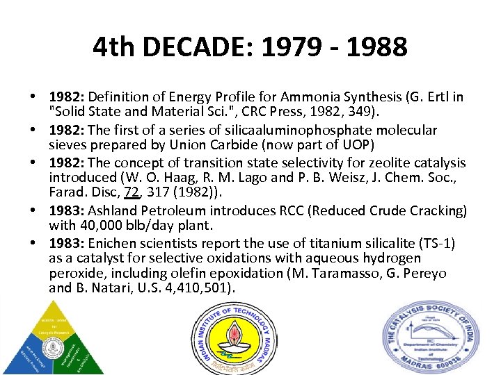 4 th DECADE: 1979 - 1988 • 1982: Definition of Energy Profile for Ammonia Synthesis (G. Ertl in "Solid State and Material Sci. ", CRC Press, 1982, 349). • 1982: The first of a series of silicaaluminophosphate molecular sieves prepared by Union Carbide (now part of UOP) • 1982: The concept of transition state selectivity for zeolite catalysis introduced (W. O. Haag, R. M. Lago and P. B. Weisz, J. Chem. Soc. , Farad. Disc, 72, 317 (1982)). • 1983: Ashland Petroleum introduces RCC (Reduced Crude Cracking) with 40, 000 blb/day plant. • 1983: Enichen scientists report the use of titanium silicalite (TS-1) as a catalyst for selective oxidations with aqueous hydrogen peroxide, including olefin epoxidation (M. Taramasso, G. Pereyo and B. Natari, U. S. 4, 410, 501).