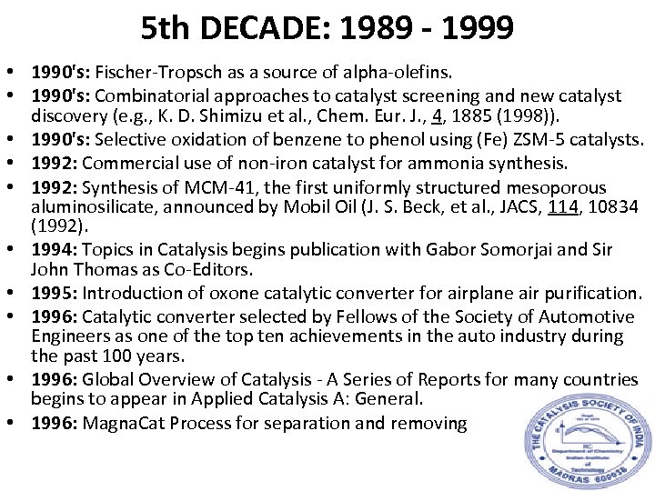 5 th DECADE: 1989 - 1999 • 1990's: Fischer-Tropsch as a source of alpha-olefins. • 1990's: Combinatorial approaches to catalyst screening and new catalyst discovery (e. g. , K. D. Shimizu et al. , Chem. Eur. J. , 4, 1885 (1998)). • 1990's: Selective oxidation of benzene to phenol using (Fe) ZSM-5 catalysts. • 1992: Commercial use of non-iron catalyst for ammonia synthesis. • 1992: Synthesis of MCM-41, the first uniformly structured mesoporous aluminosilicate, announced by Mobil Oil (J. S. Beck, et al. , JACS, 114, 10834 (1992). • 1994: Topics in Catalysis begins publication with Gabor Somorjai and Sir John Thomas as Co-Editors. • 1995: Introduction of oxone catalytic converter for airplane air purification. • 1996: Catalytic converter selected by Fellows of the Society of Automotive Engineers as one of the top ten achievements in the auto industry during the past 100 years. • 1996: Global Overview of Catalysis - A Series of Reports for many countries begins to appear in Applied Catalysis A: General. • 1996: Magna. Cat Process for separation and removing