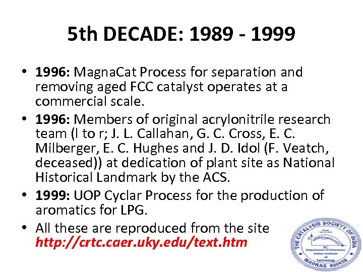 5 th DECADE: 1989 - 1999 • 1996: Magna. Cat Process for separation and removing aged FCC catalyst operates at a commercial scale. • 1996: Members of original acrylonitrile research team (l to r; J. L. Callahan, G. C. Cross, E. C. Milberger, E. C. Hughes and J. D. Idol (F. Veatch, deceased)) at dedication of plant site as National Historical Landmark by the ACS. • 1999: UOP Cyclar Process for the production of aromatics for LPG. • All these are reproduced from the site http: //crtc. caer. uky. edu/text. htm