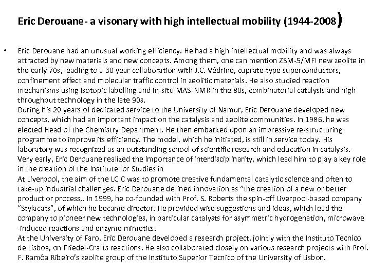 Eric Derouane- a visonary with high intellectual mobility (1944 -2008 • ) Eric Derouane had an unusual working efficiency. He had a high intellectual mobility and was always attracted by new materials and new concepts. Among them, one can mention ZSM-5/MFI new zeolite in the early 70 s, leading to a 30 year collaboration with J. C. Védrine, cuprate-type superconductors, confinement effect and molecular traffic control in zeolitic materials. He also studied reaction mechanisms using isotopic labelling and in-situ MAS-NMR in the 80 s, combinatorial catalysis and high throughput technology in the late 90 s. During his 20 years of dedicated service to the University of Namur, Eric Derouane developed new concepts, which had an important impact on the catalysis and zeolite communities. In 1986, he was elected Head of the Chemistry Department. He then embarked upon an impressive re-structuring programme to improve its efficiency. The model, which he initiated, is still in service today. His laboratory was recognized as an outstanding school of scientific research and education in catalysis. Very early, Eric Derouane realized the importance of interdisciplinarity, which lead him to play a key role in the creation of the Institute for Studies in At Liverpool, the aim of the LCIC was to promote creative fundamental catalytic science and often to take-up industrial challenges. Eric Derouane defined innovation as “the creation of a new or better product or process, . In 1999, he co-founded with Prof. S. Roberts the spin-off Liverpool-based company “Stylacats”, of which he became director. He provided wise suggestions and ideas, which lead the company to pioneer new technologies, in particular catalysts for asymmetric hydrogenation, microwave -induced reactions and enzyme mimetics. At the University of Faro, Eric Derouane developed a research project, jointly with the Instituto Tecnico de Lisboa, on Friedel-Crafts reactions. He also collaborated closely on various research projects with Prof. F. Ramôa Ribeiro’s zeolite group of the Instituto Superior Tecnico of the University of Lisbon.
