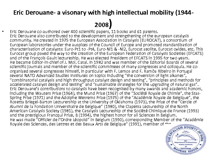 Eric Derouane- a visonary with high intellectual mobility (1944 • 2008 ) Eric Derouane co-authored over 400 scientific papers, 11 books and 61 patents. Eric Derouane also contributed to the development and strengthening of the european catalysis community. He created in 1975 the European Association in Catalysis (EUROCAT), a consortium of European laboratories under the auspices of the Council of Europe and promoted standardisation of characterisation of catalysts: Euro-Pt 1 to -Pt 4, Euro-Ni 1 & -Ni 2, Eurocat zeolite, Eurocat oxides, etc. This Eurocat group paved the way to the creation of the European Federation of Catalysis Societies (EFCATS) and of the François Gault lectureship. He was elected President of EFCATS in 1995 for two years. He became Editor-in-chief of J. Mol. Catal. in 1982 and was member of the Editorial Boards of several scientific journals and member of the scientific committees of many congresses and colloquia. He coorganized several congresses himself, in particular with F. Lemos and F. Ramôa Ribeiro in Portugal several NATO Advanced Studies Institutes on topics including “the conversion of light alkanes”, “combinatorial catalysis and high throughput catalyst design and testing”, “principles and methods for accelerated catalyst design and testing” and “sustainable strategies for the upgrading of natural gas”. Eric Derouane’s contributions to catalysis have been recognised by many awards and academic honors, including the Wauters Prize (1964), the Mund Prize (1967) of the “Société Royale de Chimie”, the Stas. Spring Prize (1971) and the Adolphe Wetrems Prize (1975) of the “Académie Royale de Belgique”, the Rosetta Briegel-Barton Lecturership at the University of Oklahoma (1973), the Prize of the “Cercle of Alumni de la Fondation Universitaire de Belgique” (1980), the Ciapetta Lectureship of the North American Catalysis Society (1981), the Catalysis Lectureship of the Société Chimique de France (1993) and the prestigious Francqui Prize, B (1994), the highest honor for all Sciences in Belgium. He was made “Officier de l’Ordre Léopold” in Belgium (1990), corresponding Member of the “Académie Royale des Sciences, des Lettres et des Beaux Arts de Belgique” (1991), member of the