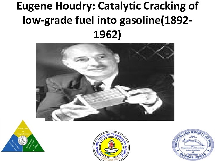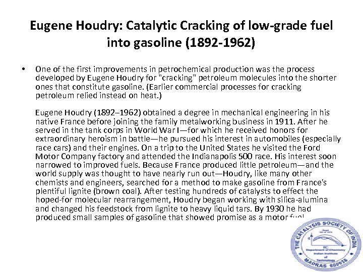 Eugene Houdry: Catalytic Cracking of low-grade fuel into gasoline (1892 -1962) • One of the first improvements in petrochemical production was the process developed by Eugene Houdry for "cracking" petroleum molecules into the shorter ones that constitute gasoline. (Earlier commercial processes for cracking petroleum relied instead on heat. ) Eugene Houdry (1892– 1962) obtained a degree in mechanical engineering in his native France before joining the family metalworking business in 1911. After he served in the tank corps in World War I—for which he received honors for extraordinary heroism in battle—he pursued his interest in automobiles (especially race cars) and their engines. On a trip to the United States he visited the Ford Motor Company factory and attended the Indianapolis 500 race. His interest soon narrowed to improved fuels. Because France produced little petroleum—and the world supply was thought to have nearly run out—Houdry, like many other chemists and engineers, searched for a method to make gasoline from France's plentiful lignite (brown coal). After testing hundreds of catalysts to effect the hoped-for molecular rearrangement, Houdry began working with silica-alumina and changed his feedstock from lignite to heavy liquid tars. By 1930 he had produced small samples of gasoline that showed promise as a motor fuel.