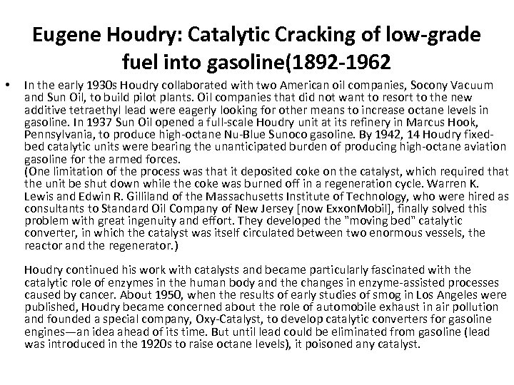 Eugene Houdry: Catalytic Cracking of low-grade fuel into gasoline(1892 -1962 • In the early 1930 s Houdry collaborated with two American oil companies, Socony Vacuum and Sun Oil, to build pilot plants. Oil companies that did not want to resort to the new additive tetraethyl lead were eagerly looking for other means to increase octane levels in gasoline. In 1937 Sun Oil opened a full-scale Houdry unit at its refinery in Marcus Hook, Pennsylvania, to produce high-octane Nu-Blue Sunoco gasoline. By 1942, 14 Houdry fixedbed catalytic units were bearing the unanticipated burden of producing high-octane aviation gasoline for the armed forces. (One limitation of the process was that it deposited coke on the catalyst, which required that the unit be shut down while the coke was burned off in a regeneration cycle. Warren K. Lewis and Edwin R. Gilliland of the Massachusetts Institute of Technology, who were hired as consultants to Standard Oil Company of New Jersey [now Exxon. Mobil], finally solved this problem with great ingenuity and effort. They developed the "moving bed" catalytic converter, in which the catalyst was itself circulated between two enormous vessels, the reactor and the regenerator. ) Houdry continued his work with catalysts and became particularly fascinated with the catalytic role of enzymes in the human body and the changes in enzyme-assisted processes caused by cancer. About 1950, when the results of early studies of smog in Los Angeles were published, Houdry became concerned about the role of automobile exhaust in air pollution and founded a special company, Oxy-Catalyst, to develop catalytic converters for gasoline engines—an idea ahead of its time. But until lead could be eliminated from gasoline (lead was introduced in the 1920 s to raise octane levels), it poisoned any catalyst.