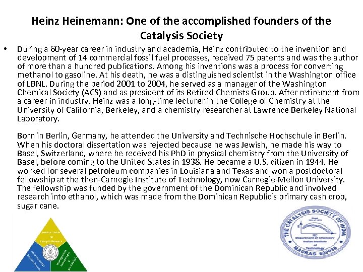 Heinz Heinemann: One of the accomplished founders of the Catalysis Society • During a 60 -year career in industry and academia, Heinz contributed to the invention and development of 14 commercial fossil fuel processes, received 75 patents and was the author of more than a hundred publications. Among his inventions was a process for converting methanol to gasoline. At his death, he was a distinguished scientist in the Washington office of LBNL. During the period 2001 to 2004, he served as a manager of the Washington Chemical Society (ACS) and as president of its Retired Chemists Group. After retirement from a career in industry, Heinz was a long-time lecturer in the College of Chemistry at the University of California, Berkeley, and a chemistry researcher at Lawrence Berkeley National Laboratory. Born in Berlin, Germany, he attended the University and Technische Hochschule in Berlin. When his doctoral dissertation was rejected because he was Jewish, he made his way to Basel, Switzerland, where he received his Ph. D in physical chemistry from the University of Basel, before coming to the United States in 1938. He became a U. S. citizen in 1944. He worked for several petroleum companies in Louisiana and Texas and won a postdoctoral fellowship at then-Carnegie Institute of Technology, now Carnegie-Mellon University. The fellowship was funded by the government of the Dominican Republic and involved research into ethanol, which was made from the Dominican Republic's primary cash crop, sugar cane.