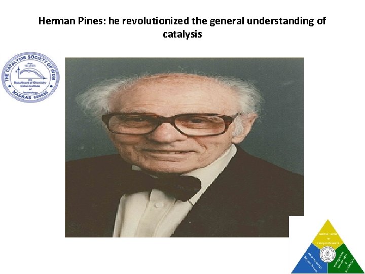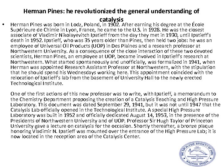 • Herman Pines: he revolutionized the general understanding of catalysis Herman Pines was born in Lodz, Poland, in 1902. After earning his degree at the École Supérieure de Chimie in Lyon, France, he came to the U. S. in 1928. He was the closest associate of Vladimir Nikolayevitch Ipatieff from the day they met in 1930, until Ipatieff's death in 1952. Ipatieff, who was 35 years older than Pines, then held two jobs: he was an employee of Universal Oil Products (UOP) in Des Plaines and a research professor at Northwestern University. As a consequence of the close interaction of these two devoted scientists, Herman Pines, an employee at UOP, became involved in Ipatieff's research at Northwestern. What started spontaneously and unofficially, was formalized in 1941, when Herman was appointed Research Assistant Professor at Northwestern, with the stipulation that he should spend his Wednesdays working here. This appointment coincided with the relocation of Ipatieff's lab from the basement of University Hall to the newly erected Technological Institute. One of the first actions of this new professor was to write, with Ipatieff, a memorandum to the Chemistry Department proposing the creation of a Catalysis Teaching and High Pressure Laboratory. This document was dated September 29, 1941, but it was not until 1947 that the Catalysis Lab officially opened in the Technological Institute. A special High Pressure Laboratory was built in 1952 and officially dedicated August 14, 1953, in the presence of the Presidents of Northwestern University and of UOP. Professor Sir Hugh Taylor of Princeton University gave a lecture on catalysis for the occasion. Shortly thereafter, a bronze plaque honoring Vladimir N. Ipatieff was mounted over the entrance of the High Pressure Lab; it is now located in the reception area of the Catalysis Center.
