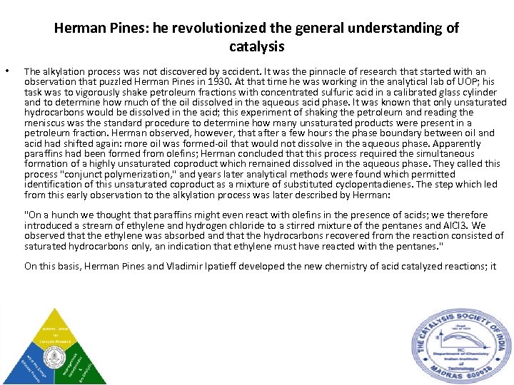 Herman Pines: he revolutionized the general understanding of catalysis • The alkylation process was not discovered by accident. It was the pinnacle of research that started with an observation that puzzled Herman Pines in 1930. At that time he was working in the analytical lab of UOP; his task was to vigorously shake petroleum fractions with concentrated sulfuric acid in a calibrated glass cylinder and to determine how much of the oil dissolved in the aqueous acid phase. It was known that only unsaturated hydrocarbons would be dissolved in the acid; this experiment of shaking the petroleum and reading the meniscus was the standard procedure to determine how many unsaturated products were present in a petroleum fraction. Herman observed, however, that after a few hours the phase boundary between oil and acid had shifted again: more oil was formed-oil that would not dissolve in the aqueous phase. Apparently paraffins had been formed from olefins; Herman concluded that this process required the simultaneous formation of a highly unsaturated coproduct which remained dissolved in the aqueous phase. They called this process "conjunct polymerization, " and years later analytical methods were found which permitted identification of this unsaturated coproduct as a mixture of substituted cyclopentadienes. The step which led from this early observation to the alkylation process was later described by Herman: "On a hunch we thought that paraffins might even react with olefins in the presence of acids; we therefore introduced a stream of ethylene and hydrogen chloride to a stirred mixture of the pentanes and Al. Cl 3. We observed that the ethylene was absorbed and that the hydrocarbons recovered from the reaction consisted of saturated hydrocarbons only, an indication that ethylene must have reacted with the pentanes. " On this basis, Herman Pines and Vladimir Ipatieff developed the new chemistry of acid catalyzed reactions; it