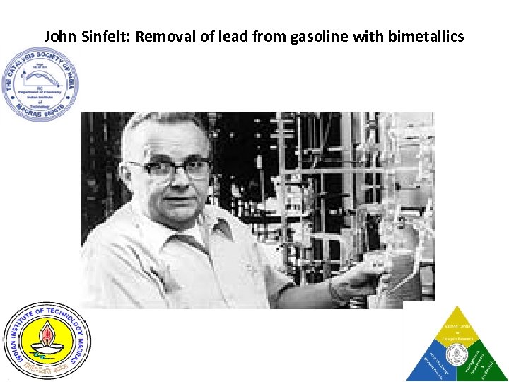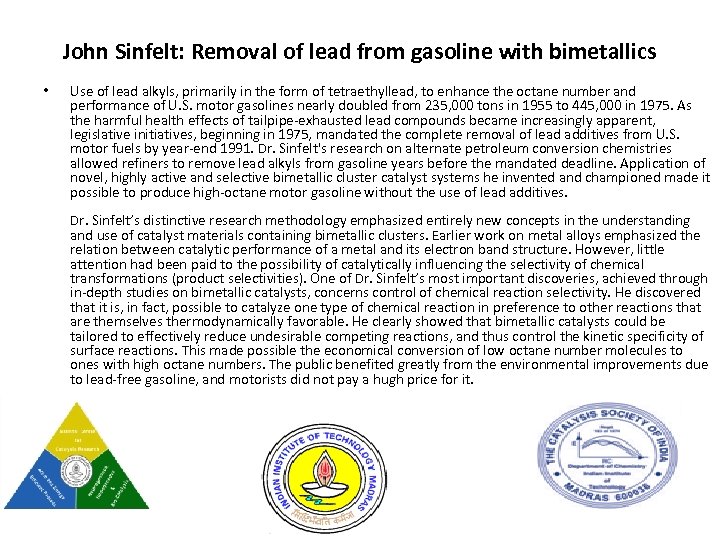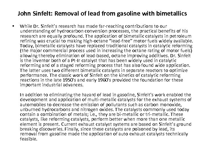 John Sinfelt: Removal of lead from gasoline with bimetallics • Use of lead alkyls, primarily in the form of tetraethyllead, to enhance the octane number and performance of U. S. motor gasolines nearly doubled from 235, 000 tons in 1955 to 445, 000 in 1975. As the harmful health effects of tailpipe-exhausted lead compounds became increasingly apparent, legislative initiatives, beginning in 1975, mandated the complete removal of lead additives from U. S. motor fuels by year-end 1991. Dr. Sinfelt's research on alternate petroleum conversion chemistries allowed refiners to remove lead alkyls from gasoline years before the mandated deadline. Application of novel, highly active and selective bimetallic cluster catalyst systems he invented and championed made it possible to produce high-octane motor gasoline without the use of lead additives. Dr. Sinfelt’s distinctive research methodology emphasized entirely new concepts in the understanding and use of catalyst materials containing bimetallic clusters. Earlier work on metal alloys emphasized the relation between catalytic performance of a metal and its electron band structure. However, little attention had been paid to the possibility of catalytically influencing the selectivity of chemical transformations (product selectivities). One of Dr. Sinfelt’s most important discoveries, achieved through in-depth studies on bimetallic catalysts, concerns control of chemical reaction selectivity. He discovered that it is, in fact, possible to catalyze one type of chemical reaction in preference to other reactions that are themselves thermodynamically favorable. He clearly showed that bimetallic catalysts could be tailored to effectively reduce undesirable competing reactions, and thus control the kinetic specificity of surface reactions. This made possible the economical conversion of low octane number molecules to ones with high octane numbers. The public benefited greatly from the environmental improvements due to lead-free gasoline, and motorists did not pay a hugh price for it.
