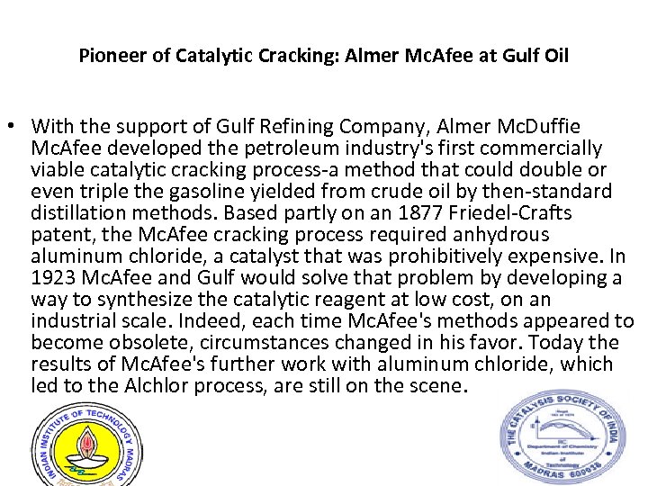 Pioneer of Catalytic Cracking: Almer Mc. Afee at Gulf Oil • With the support of Gulf Refining Company, Almer Mc. Duffie Mc. Afee developed the petroleum industry's first commercially viable catalytic cracking process-a method that could double or even triple the gasoline yielded from crude oil by then-standard distillation methods. Based partly on an 1877 Friedel-Crafts patent, the Mc. Afee cracking process required anhydrous aluminum chloride, a catalyst that was prohibitively expensive. In 1923 Mc. Afee and Gulf would solve that problem by developing a way to synthesize the catalytic reagent at low cost, on an industrial scale. Indeed, each time Mc. Afee's methods appeared to become obsolete, circumstances changed in his favor. Today the results of Mc. Afee's further work with aluminum chloride, which led to the Alchlor process, are still on the scene.
