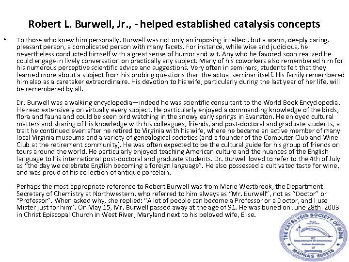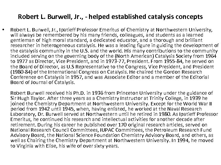 Robert L. Burwell, Jr. , - helped established catalysis concepts • Robert L. Burwell, Jr. , Ipatieff Professor Emeritus of Chemistry at Northwestern University, will always be remembered by his many friends, colleagues, and students as a learned gentleman of high moral standard, a dedicated educator, and a thorough and brilliant researcher in heterogeneous catalysis. He was a leading figure in guiding the development of the catalysis community in the U. S. and the world. His many contributions to the community included serving on the governing body of the (North American) Catalysis Society from 1964 to 1977 as Director, Vice President, and in 1973 -77, President. From 1955 -84, he served on the Board of Director, as U. S Representative to the Congress, Vice President, and President (1980 -84) of the International Congress on Catalysis. He chaired the Gordon Research Conference on Catalysis in 1957, and was Associate Editor and a member of the Editorial Board of Journal of Catalysis. Robert Burwell received his Ph. D. in 1936 from Princeton University under the guidance of Sir Hugh Taylor. After three years as a Chemistry Instructor at Trinity College, in 1939 he joined the Chemistry Department at Northwestern University. Except for the World War II period from 1942 until 1945, when, having enlisted, he worked at the Naval Research Laboratory, Dr. Burwell served at Northwestern until he retired in 1980. As Ipatieff Professor Emeritus, he continued his research and intellectual activities for another decade after retirement. During his career he published over 170 original research articles, served on National Research Council Committees, IUPAC Committees, the Petroleum Research Fund Advisory Board, the National Science Foundation Chemistry Advisory Board, and others, as well as Chairing the Chemistry Department at Northwestern University. In 1994, he moved to Virginia with Elise, his wife of over sixty years.