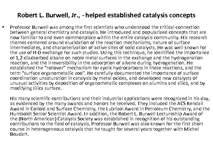 Robert L. Burwell, Jr. , - helped established catalysis concepts • Professor Burwell was among the first scientists who understood the critical connection between general chemistry and catalysis. He introduced and popularized concepts that are now familiar to and even commonplace within the entire catalysis community. His research themes centered around elucidation of the reaction mechanisms, nature of surface intermediates, and characterization of active sites of solid catalysts. He was well known for the use of H-D exchange for such studies. Using this technique, he identified the importance of 1, 2 -diadsorbed alkane on noble metal surfaces in the exchange and the hydrogenation reaction, and the irreversibility in the adsorption of alkene during hydrogenation. He established the “rollover” mechanism for cyclic hydrocarbons in these reactions, and the term “surface organometallic zoo”. He carefully documented the importance of surface coordination unsaturation in catalysis by metal oxides, and developed new catalysts of unusual activities by deposition of organometallic complexes on alumina and silica, and by modifying silica surface. His many scientific contributions and their industrial applications were recognized in his day, as evidenced by the many awards and honors he received. They included the ACS Kendall Award in Colloid and Surface Chemistry, the Lubrizol Award in Petroleum Chemistry, and the Humboldt Senior Scientist Award. In addition, the Robert L. Burwell Lectureship Award of the (North American) Catalysis Society was established in recognition of his outstanding contributions to the field of catalysis. Professor Burwell was also known for the first short course in heterogeneous catalysis that he taught for several years together with Michel Boudart.