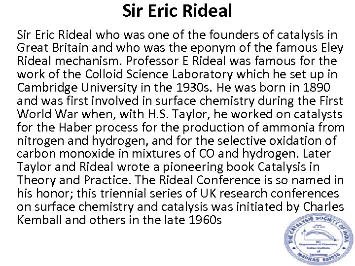 Sir Eric Rideal who was one of the founders of catalysis in Great Britain and who was the eponym of the famous Eley Rideal mechanism. Professor E Rideal was famous for the work of the Colloid Science Laboratory which he set up in Cambridge University in the 1930 s. He was born in 1890 and was first involved in surface chemistry during the First World War when, with H. S. Taylor, he worked on catalysts for the Haber process for the production of ammonia from nitrogen and hydrogen, and for the selective oxidation of carbon monoxide in mixtures of CO and hydrogen. Later Taylor and Rideal wrote a pioneering book Catalysis in Theory and Practice. The Rideal Conference is so named in his honor; this triennial series of UK research conferences on surface chemistry and catalysis was initiated by Charles Kemball and others in the late 1960 s