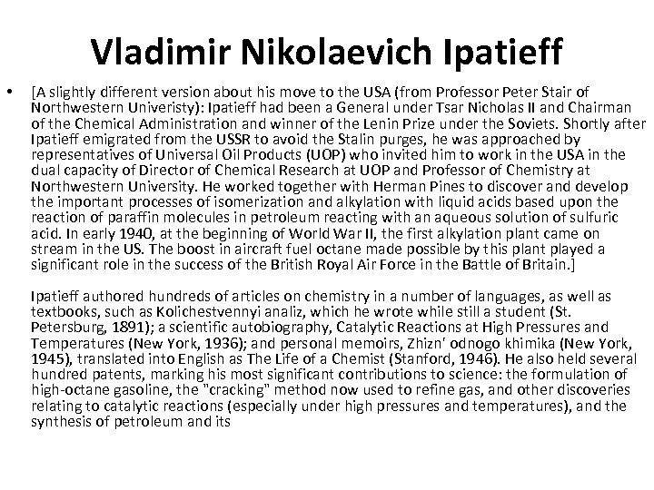 Vladimir Nikolaevich Ipatieff • [A slightly different version about his move to the USA (from Professor Peter Stair of Northwestern Univeristy): Ipatieff had been a General under Tsar Nicholas II and Chairman of the Chemical Administration and winner of the Lenin Prize under the Soviets. Shortly after Ipatieff emigrated from the USSR to avoid the Stalin purges, he was approached by representatives of Universal Oil Products (UOP) who invited him to work in the USA in the dual capacity of Director of Chemical Research at UOP and Professor of Chemistry at Northwestern University. He worked together with Herman Pines to discover and develop the important processes of isomerization and alkylation with liquid acids based upon the reaction of paraffin molecules in petroleum reacting with an aqueous solution of sulfuric acid. In early 1940, at the beginning of World War II, the first alkylation plant came on stream in the US. The boost in aircraft fuel octane made possible by this plant played a significant role in the success of the British Royal Air Force in the Battle of Britain. ] Ipatieff authored hundreds of articles on chemistry in a number of languages, as well as textbooks, such as Kolichestvennyi analiz, which he wrote while still a student (St. Petersburg, 1891); a scientific autobiography, Catalytic Reactions at High Pressures and Temperatures (New York, 1936); and personal memoirs, Zhizn' odnogo khimika (New York, 1945), translated into English as The Life of a Chemist (Stanford, 1946). He also held several hundred patents, marking his most significant contributions to science: the formulation of high-octane gasoline, the "cracking" method now used to refine gas, and other discoveries relating to catalytic reactions (especially under high pressures and temperatures), and the synthesis of petroleum and its