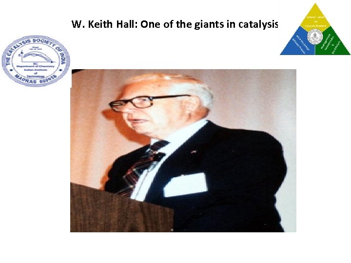 W. Keith Hall: One of the giants in catalysis • Keith's publications have had a profound impact on the catalytic community. Over a score of these have been cited more than a hundred times by others. These include each of those mentioned in the previous discussion as we traced Keith's areas of research. Altogether he had more than 4, 000 citations to his work. Keith served and led the Catalytic and Chemical community in several ways. He was the editor on the Journal of Catalysis from 1967 to 1989, a period when J. Catalysis became the primary Journal in heterogeneous catalysis. Frank Stone was the European editor and they were close friends. Keith was the president of the Catalysis Society of North America from 1981 -85 and founded the Catalysis Society Trust, which has given the society on a strong fiscal base. Keith gave five lectures at Gordon Conferences, was chairman of the Gordon Conference on Catalysis, and served as a Trustee of the Gordon Conferences from 1981 -87. Who can forget his perennial presence in the front row of the Gordon Conferences where he would challenge and extrapolate the concepts presented as well as remind the speakers of the prior-art they may have neglected to mention? He had the same room at the conference for many years which was closest to the late night discussions in which he participated actively. In the afternoon he would sail and discuss the concepts of the catalytic science presented. Keith was also active in the ACS and served on the executive committee on the Colloid and Surface Chemistry Division.