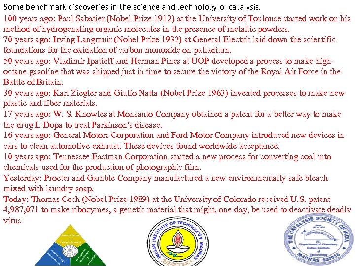 Some benchmark discoveries in the science and technology of catalysis. 100 years ago: Paul Sabatier (Nobel Prize 1912) at the University of Toulouse started work on his method of hydrogenating organic molecules in the presence of metallic powders. 70 years ago: Irving Langmuir (Nobel Prize 1932) at General Electric laid down the scientific foundations for the oxidation of carbon monoxide on palladium. 50 years ago: Vladimir Ipatieff and Herman Pines at UOP developed a process to make highoctane gasoline that was shipped just in time to secure the victory of the Royal Air Force in the Battle of Britain. 30 years ago: Karl Ziegler and Giulio Natta (Nobel Prize 1963) invented processes to make new plastic and fiber materials. 17 years ago: W. S. Knowles at Monsanto Company obtained a patent for a better way to make the drug L-Dopa to treat Parkinson's disease. 16 years ago: General Motors Corporation and Ford Motor Company introduced new devices in cars to clean automotive exhaust. These devices found worldwide acceptance. 10 years ago: Tennessee Eastman Corporation started a new process for converting coal into chemicals used for the production of photographic film. Yesterday: Procter and Gamble Company manufactured a new environmentally safe bleach mixed with laundry soap. Today: Thomas Cech (Nobel Prize 1989) at the University of Colorado received U. S. patent 4, 987, 071 to make ribozymes, a genetic material that might, one day, be used to deactivate deadly virus