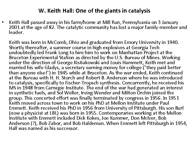 W. Keith Hall: One of the giants in catalysis • Keith Hall passed away in his farm/home at Mill Run, Pennsylvania on 3 January 2001 at the age of 82. The catalytic community has lost a major family-member and leader. Keith was born in Mc. Comb, Ohio and graduated from Emory University in 1940. Shortly thereafter, a summer course in high explosives at Georgia Tech undoubtedly led Frank Long to hire him to work on Manhattan Project at the Bruceton Experimental Station as directed by the U. S. Bureau of Mines. Working under the direction of George Kistiakowski and Louis Hammett, Keith met and married his wife Gladys, a secretary earning money for college ("they paid better than anyone else!") in 1945 while at Bruceton. As the war ended, Keith continued at the Bureau with H. H. Storch and Robert B. Anderson where he was introduced to catalysis, specifically to Fischer-Tropsch synthesis. Concurrently, he received his MS in 1948 from Carnegie Institute. The end of the war had generated an interest in synthetic fuels, and Sol Weller, Irving Wender and Milton Orchin joined the group. This concerted effort was finally terminated by congress in 1956. In 1951 Keith moved across town to work on his Ph. D at Mellon Institute under Paul Emmett. Keith received his Ph. D in 1956 from University of Pittsburgh. His son Burl (now a physicist at LBL) was born in 1955. Contemporaries working at the Mellon Institute with Emmett included Dick Kokes, Joe Kummer, Don Mc. Iver, Bob Anderson (? ), Bob Zabor, and Bob Haldeman. When Emmett left Pittsburgh in 1954, Hall was named as his successor.