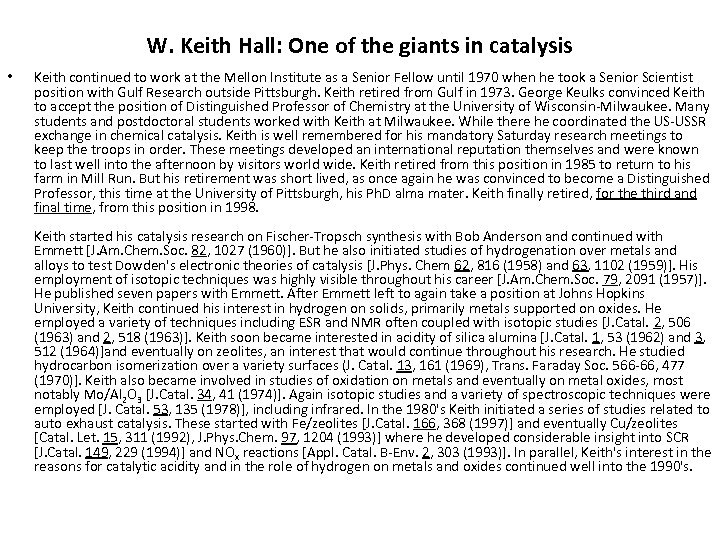 W. Keith Hall: One of the giants in catalysis • Keith continued to work at the Mellon Institute as a Senior Fellow until 1970 when he took a Senior Scientist position with Gulf Research outside Pittsburgh. Keith retired from Gulf in 1973. George Keulks convinced Keith to accept the position of Distinguished Professor of Chemistry at the University of Wisconsin-Milwaukee. Many students and postdoctoral students worked with Keith at Milwaukee. While there he coordinated the US-USSR exchange in chemical catalysis. Keith is well remembered for his mandatory Saturday research meetings to keep the troops in order. These meetings developed an international reputation themselves and were known to last well into the afternoon by visitors world wide. Keith retired from this position in 1985 to return to his farm in Mill Run. But his retirement was short lived, as once again he was convinced to become a Distinguished Professor, this time at the University of Pittsburgh, his Ph. D alma mater. Keith finally retired, for the third and final time, from this position in 1998. Keith started his catalysis research on Fischer-Tropsch synthesis with Bob Anderson and continued with Emmett [J. Am. Chem. Soc. 82, 1027 (1960)]. But he also initiated studies of hydrogenation over metals and alloys to test Dowden's electronic theories of catalysis [J. Phys. Chem 62, 816 (1958) and 63, 1102 (1959)]. His employment of isotopic techniques was highly visible throughout his career [J. Am. Chem. Soc. 79, 2091 (1957)]. He published seven papers with Emmett. After Emmett left to again take a position at Johns Hopkins University, Keith continued his interest in hydrogen on solids, primarily metals supported on oxides. He employed a variety of techniques including ESR and NMR often coupled with isotopic studies [J. Catal. 2, 506 (1963) and 2, 518 (1963)]. Keith soon became interested in acidity of silica alumina [J. Catal. 1, 53 (1962) and 3, 512 (1964)]and eventually on zeolites, an interest that would continue throughout his research. He studied hydrocarbon isomerization over a variety surfaces (J. Catal. 13, 161 (1969), Trans. Faraday Soc. 566 -66, 477 (1970)]. Keith also became involved in studies of oxidation on metals and eventually on metal oxides, most notably Mo/Al 2 O 3 [J. Catal. 34, 41 (1974)]. Again isotopic studies and a variety of spectroscopic techniques were employed [J. Catal. 53, 135 (1978)], including infrared. In the 1980's Keith initiated a series of studies related to auto exhaust catalysis. These started with Fe/zeolites [J. Catal. 166, 368 (1997)] and eventually Cu/zeolites [Catal. Let. 15, 311 (1992), J. Phys. Chem. 97, 1204 (1993)] where he developed considerable insight into SCR [J. Catal. 149, 229 (1994)] and NOx reactions [Appl. Catal. B-Env. 2, 303 (1993)]. In parallel, Keith's interest in the reasons for catalytic acidity and in the role of hydrogen on metals and oxides continued well into the 1990's.