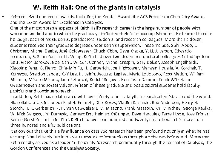 W. Keith Hall: One of the giants in catalysis • Keith received numerous awards, including the Kendall Award, the ACS Petroleum Chemistry Award, and the Exxon Award for Excellence in Catalysis. One of the most notable aspects of Keith Hall's research career is the large number of people with whom he worked and to whom he graciously attributed their joint accomplishments. He learned from as he taught each of his students, postdoctoral students, and research colleagues. More than a dozen students received their graduate degrees under Keith's supervision. These include: Suhil Abdo, L. Christner, Michel Deeba, José Goldwasser, Chuck Kibby, Dave Kreske, Y. Li, J. Larson, Edwardo Lombardo, R. Schneider and L. Wang. Keith had over two dozen postdoctoral colleagues including: John Bett, Victor Borokov, Noel Cant, W. Curt Conner, Michel Crespin, Gary Delzer, Joseph Engelhardt, Xiaobing Feng, G. Fierro, Chia-Min Fu, H. Gerberich, Joe Hightower, Marwan Houalla, V. Korchak, T. Komatsu, Sheldon Lande , K. -Y Lee, H. Leftin, Jacques Leglise, Mario Lo Jocono, Ross Madon, William Millman, Mikoto Misono, Jaun Petunchi, Ko-ichi Segawa, Henri Van Damme, Frank Witzel, Jan Uytterhoeven and Jozsef Valyon. Fifteen of these graduate and postdoctoral students hold faculty positions and continue to teach. In addition, Keith has collaborated with over ninety other catalytic research scientists around the world. His collaborators included: Paul H. Emmett, Dick Kokes, Vladim Kazanski, Bob Anderson, Henry H. Storch, H. R. Gerberich, F. H. Van Cauwelaert, M. Missono, Frank Massoth, Kh. Minichev, George Keulks, W. Nick Delgass, Jim Dumesic, Gerhart Ertl, Helmut Knözinger, Dave Hercules, Farrell Lytle, Jose Fripiat, Bernie Gerstein and Julie d'Itri. Keith had over one hundred and twenty co-authors in his more than three hundred and fifty publications. It is obvious that Keith Hall's influence on catalytic research has been profound not only in what he has accomplished directly but in his vast network of interactions throughout the catalytic world. Moreover, Keith readily served as a leader in the catalytic research community through the Journal of Catalysis, the Gordon Conferences and the Catalysis Society.