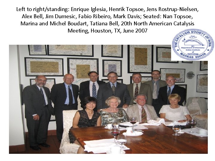 Left to right/standing: Enrique Iglesia, Henrik Topsoe, Jens Rostrup-Nielsen, Alex Bell, Jim Dumesic, Fabio Ribeiro, Mark Davis; Seated: Nan Topsoe, Marina and Michel Boudart, Tatiana Bell, 20 th North American Catalysis Meeting, Houston, TX, June 2007