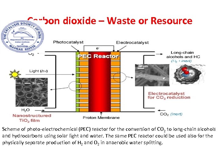 Carbon dioxide – Waste or Resource Scheme of photo-electrochemical (PEC) reactor for the conversion of CO 2 to long-chain alcohols and hydrocarbons using solar light and water. The same PEC reactor could be used also for the physically separate production of H 2 and O 2 in anaerobic water splitting.