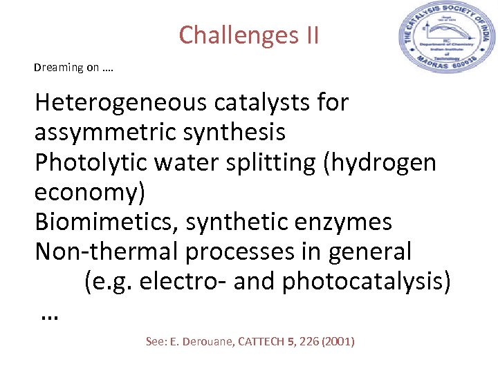 Challenges II Dreaming on …. Heterogeneous catalysts for assymmetric synthesis Photolytic water splitting (hydrogen economy) Biomimetics, synthetic enzymes Non-thermal processes in general (e. g. electro- and photocatalysis) … See: E. Derouane, CATTECH 5, 226 (2001)
