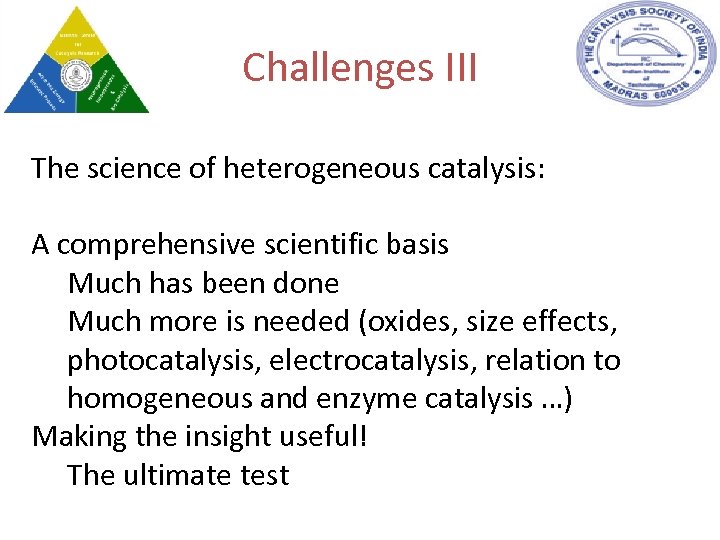 Challenges III The science of heterogeneous catalysis: A comprehensive scientific basis Much has been done Much more is needed (oxides, size effects, photocatalysis, electrocatalysis, relation to homogeneous and enzyme catalysis …) Making the insight useful! The ultimate test