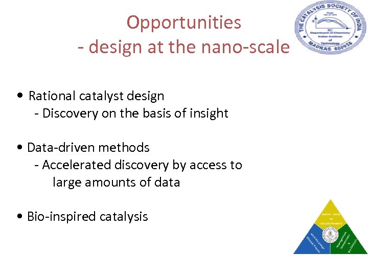 Opportunities - design at the nano-scale • Rational catalyst design - Discovery on the basis of insight • Data-driven methods - Accelerated discovery by access to large amounts of data • Bio-inspired catalysis
