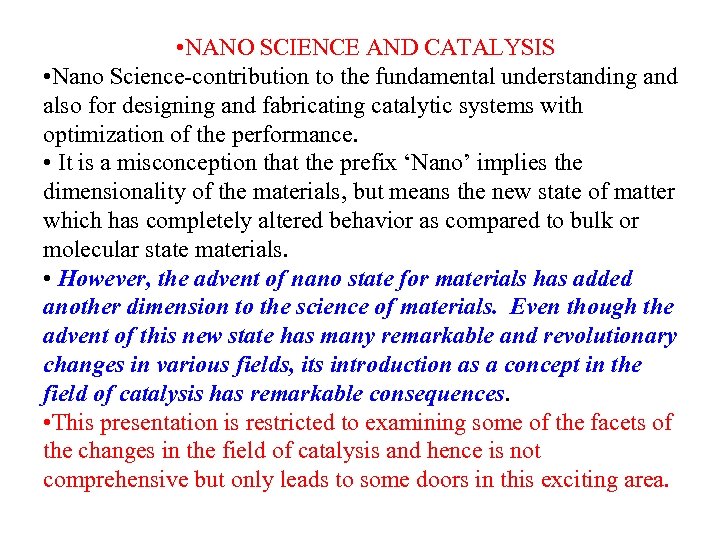 • NANO SCIENCE AND CATALYSIS • Nano Science-contribution to the fundamental understanding and also for designing and fabricating catalytic systems with optimization of the performance. • It is a misconception that the prefix ‘Nano’ implies the dimensionality of the materials, but means the new state of matter which has completely altered behavior as compared to bulk or molecular state materials. • However, the advent of nano state for materials has added another dimension to the science of materials. Even though the advent of this new state has many remarkable and revolutionary changes in various fields, its introduction as a concept in the field of catalysis has remarkable consequences. • This presentation is restricted to examining some of the facets of the changes in the field of catalysis and hence is not comprehensive but only leads to some doors in this exciting area.