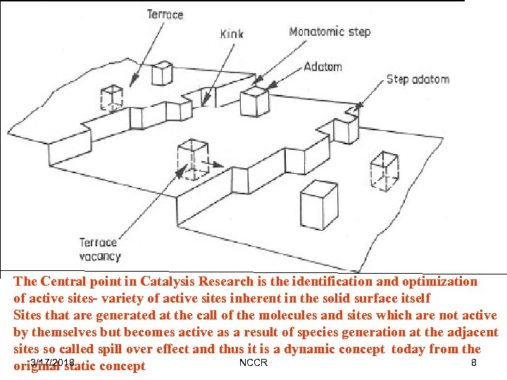The Central point in Catalysis Research is the identification and optimization of active sites- variety of active sites inherent in the solid surface itself Sites that are generated at the call of the molecules and sites which are not active by themselves but becomes active as a result of species generation at the adjacent sites so called spill over effect and thus it is a dynamic concept today from the 3/17/2018 NCCR 8 original static concept