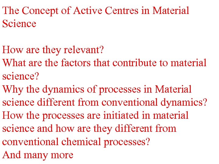 The Concept of Active Centres in Material Science How are they relevant? What are the factors that contribute to material science? Why the dynamics of processes in Material science different from conventional dynamics? How the processes are initiated in material science and how are they different from conventional chemical processes? And many more
