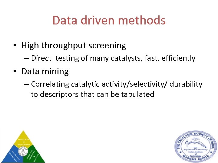 Data driven methods • High throughput screening – Direct testing of many catalysts, fast, efficiently • Data mining – Correlating catalytic activity/selectivity/ durability to descriptors that can be tabulated
