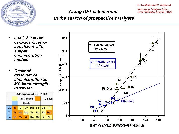 H. Toulhoat and P. Raybaud Using DFT calculations in the search of prospective catalysts • E MC @ Fm-3 m carbides is rather consistent with simple chemisorption models • Onset of dissociative chemisorption as MC bond strength increases Workshop Catalysis from First Principles Vienna 02/02