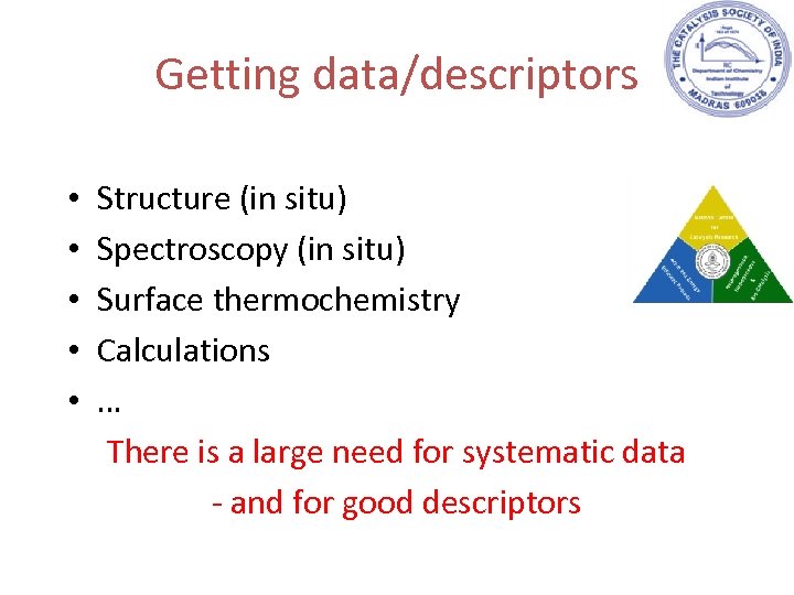 Getting data/descriptors • • • Structure (in situ) Spectroscopy (in situ) Surface thermochemistry Calculations … There is a large need for systematic data - and for good descriptors