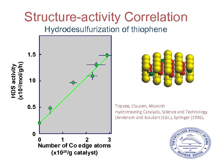 Structure-activity Correlation Hydrodesulfurization of thiophene HDS activity (x 102/mol/g/h) 1. 5 10 Topsøe, Clausen, Massoth Hydrotreating Catalysis, Science and Technology (Anderson and Boudart (Eds. ), Springer (1996). 0. 5 0 0 1 2 3 Number of Co edge atoms (x 1020/g catalyst)