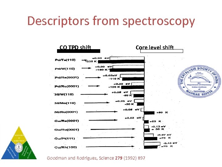 Descriptors from spectroscopy CO TPD shift Core level shift Goodman and Rodriguez, Science 279 (1992) 897