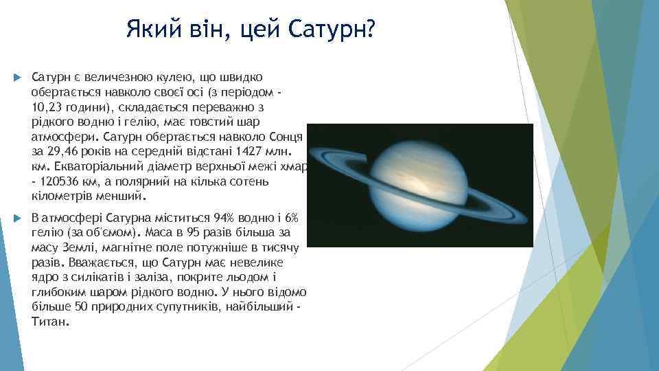 Який він, цей Сатурн? Сатурн є величезною кулею, що швидко обертається навколо своєї осі (з періодом 10, 23 години), складається переважно з рідкого водню і гелію, має товстий шар атмосфери. Сатурн обертається навколо Сонця за 29, 46 років на середній відстані 1427 млн. км. Екваторіальний діаметр верхньої межі хмар - 120536 км, а полярний на кілька сотень кілометрів менший. В атмосфері Сатурна міститься 94% водню і 6% гелію (за об'ємом). Маса в 95 разів більша за масу Землі, магнітне поле потужніше в тисячу разів. Вважається, що Сатурн має невелике ядро з силікатів і заліза, покрите льодом і глибоким шаром рідкого водню. У нього відомо більше 50 природних супутників, найбільший Титан.
