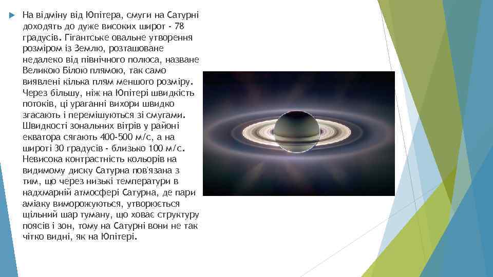 На відміну від Юпітера, смуги на Сатурні доходять до дуже високих широт - 78 градусів. Гігантське овальне утворення розміром із Землю, розташоване недалеко від північного полюса, назване Великою Білою плямою, так само виявлені кілька плям меншого розміру. Через більшу, ніж на Юпітері швидкість потоків, ці ураганні вихори швидко згасають і перемішуються зі смугами. Швидкості зональних вітрів у районі екватора сягають 400 -500 м/с, а на широті 30 градусів - близько 100 м/с. Невисока контрастність кольорів на видимому диску Сатурна пов'язана з тим, що через низькі температури в надхмарній атмосфері Сатурна, де пари аміаку виморожуються, утворюється щільний шар туману, що ховає структуру поясів і зон, тому на Сатурні вони не так чітко видні, як на Юпітері.