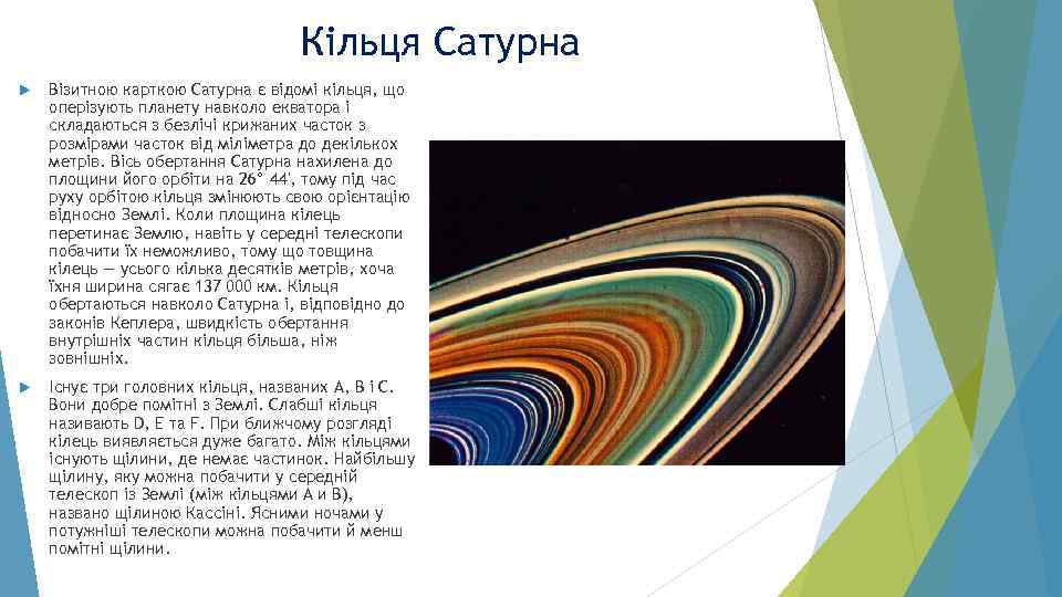 Кільця Сатурна Візитною карткою Сатурна є відомі кільця, що оперізують планету навколо екватора і складаються з безлічі крижаних часток з розмірами часток від міліметра до декількох метрів. Вісь обертання Сатурна нахилена до площини його орбіти на 26° 44', тому під час руху орбітою кільця змінюють свою орієнтацію відносно Землі. Коли площина кілець перетинає Землю, навіть у середні телескопи побачити їх неможливо, тому що товщина кілець — усього кілька десятків метрів, хоча їхня ширина сягає 137 000 км. Кільця обертаються навколо Сатурна і, відповідно до законів Кеплера, швидкість обертання внутрішніх частин кільця більша, ніж зовнішніх. Існує три головних кільця, названих A, B і C. Вони добре помітні з Землі. Слабші кільця називають D, E та F. При ближчому розгляді кілець виявляється дуже багато. Між кільцями існують щілини, де немає частинок. Найбільшу щілину, яку можна побачити у середній телескоп із Землі (між кільцями А и В), названо щілиною Кассіні. Ясними ночами у потужніші телескопи можна побачити й менш помітні щілини.