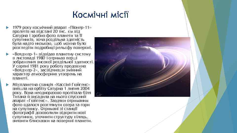 Космічні місії 1979 року космічний апарат «Піонер-11» пролетів на відстані 20 тис. км від Сатурна і зробив фото планети та її супутників, хоча роздільна здатність була надто низькою, щоб можна було розгледіти подробиці рельєфу поверхні. «Вояджер-1» відвідав планетну систему в листопаді 1980 і отримав перші зображення високої роздільної здатності. У серпні 1981 року роботу продовжив «Вояджер-2» , засвідчивши змінний характер атмосферних утворень на планеті. Міжпланетна станція «Кассіні-Гюйгенс» вийшла на орбіту Сатурна 1 липня 2004 року. Вона неодноразово пролітала біля Титана й висадила на нього спускний апарат «Гюйгенс» . Завдяки отриманим фото вдалося розглянути озера та гори на супутнику. Отримані зі станції фотографії дозоволили відкрити нові супутники, уточнити структуру кілець, виявити блискавки на поверхні планети.